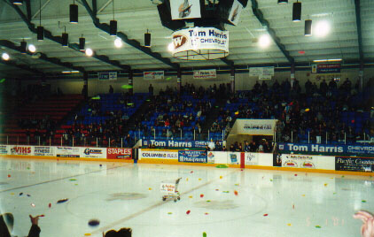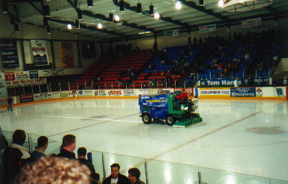 Как всем давно известно Канада это Родина хоккея на льду и какждый уважающий себя город в Канаде имеет одну хоккейную команду. Не важно какую, профисиональную или не очень, но имеет. Любит канадец после трудного рабочего дня посмотреть хоккей, в живую или по телевизору, не важно, но в живую конечно лучше :))) Так вот, Нанаймо тоже не исключение, тут тожа имееться хоккейная команда Нанаймо Клипперс, отсюда вышли такие звезды как Пол и Стив Карии. Конечно же не мог и я сходить на одну из этих игр, не очень что бы красиво играют, но хоть так чем никак :))) Как говориться главное не победа, а участие :))) Хотя Клипперсы в этом году не так уж и плохо играют, на всех играх на которые я ходил они побеждали. Вашему покорному слуге, испорченным новыми технологиями и здешним телевидением, постоянно не хватало повтора или кнопки перемотки:))) В реальной жизни все гароздо быстрей чем на телевидении, вот так-то :))) Но ничего я быстро привык и больше не стал глазет по сторонам, а стал наблюдать за игрой :))) ![]() ![]() А вот что происходить во время перерывов :))) Различные спонсоры проводят различные конкурсы и состязания:))) ![]() а это всем известная машина под названием замбони. Не машина, зверь :)))